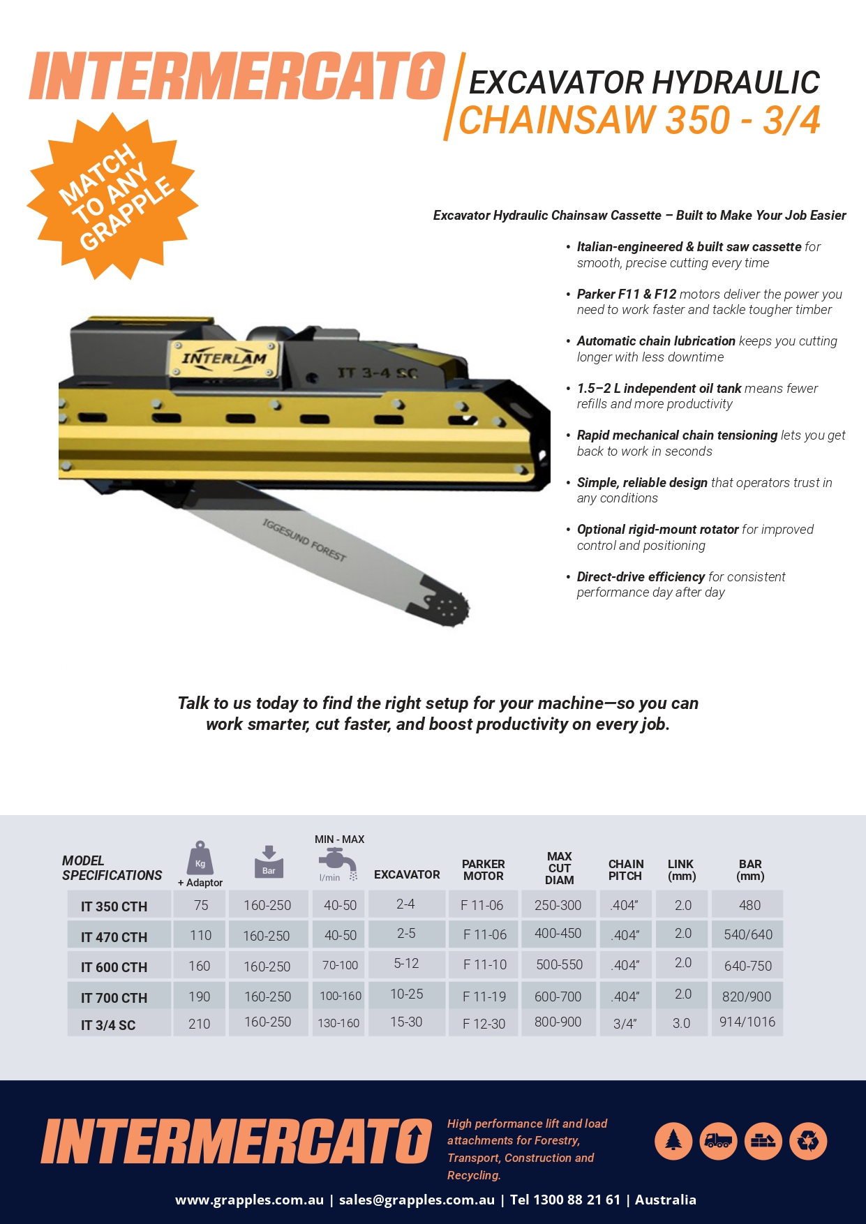 Intermercato Grapples provides the largest range of grapples including chainsaws in Australia, to suit most skid steers, loaders, and excavators.